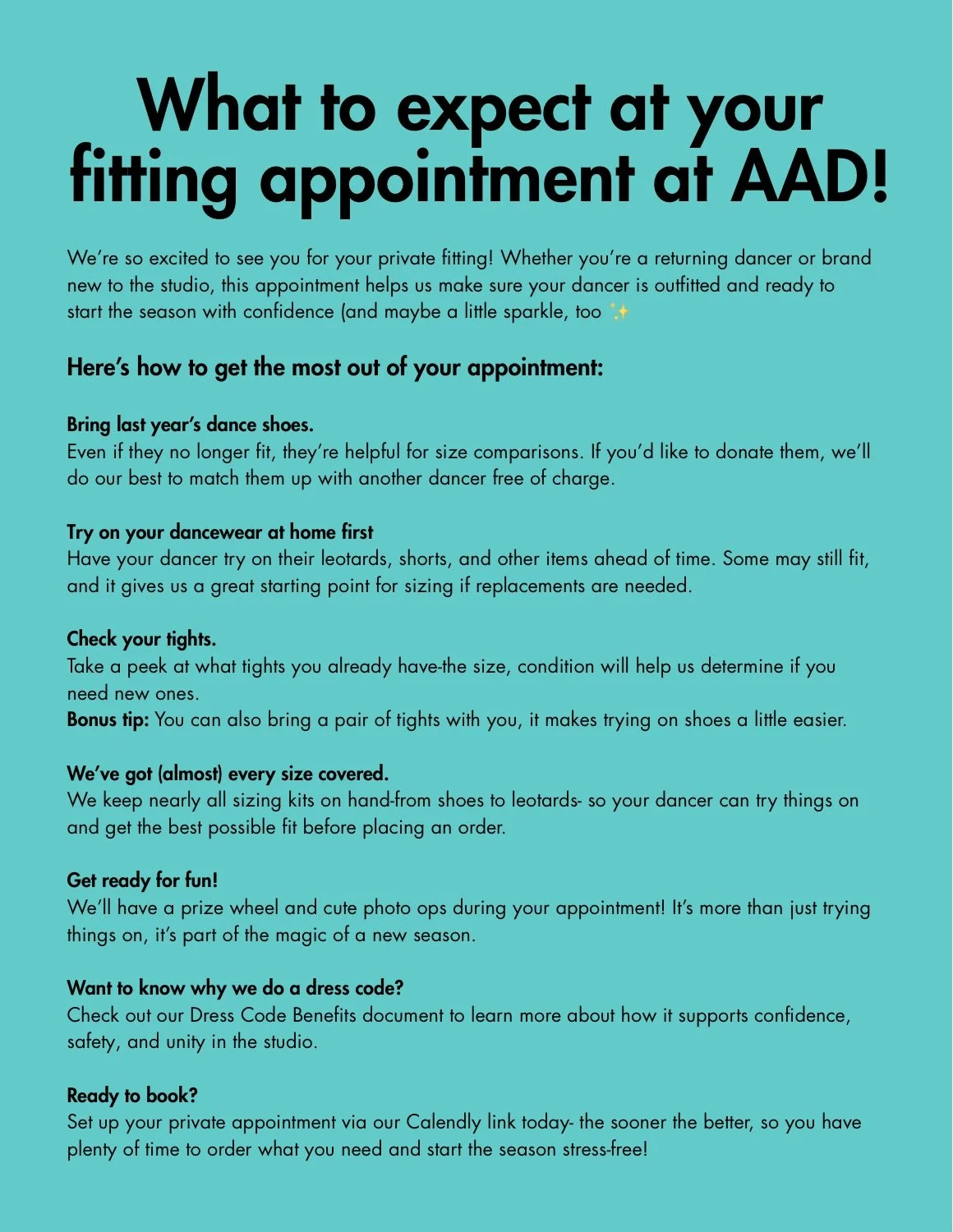 Reminder: Contact AAD to schedule your fitting! Sizes can be very tricky for dance wear.